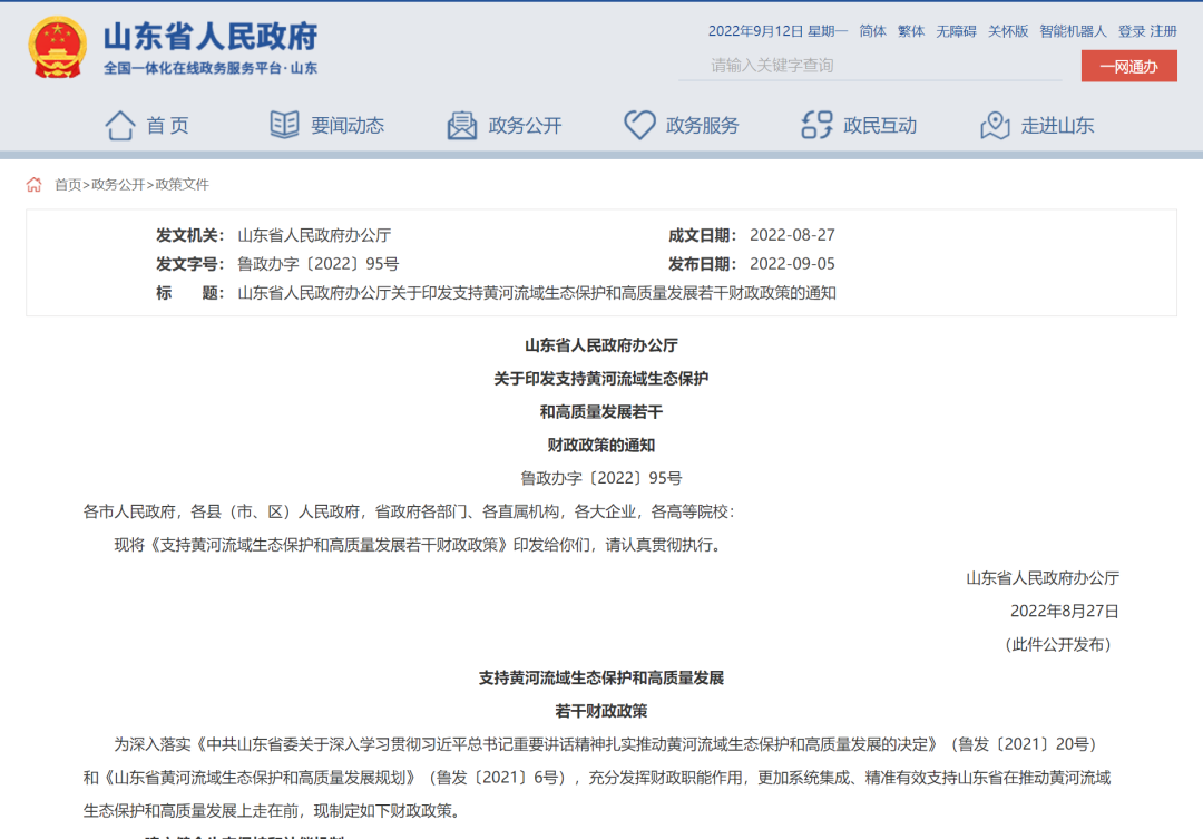 近日,山东省人民政府办公厅印发《支持黄河流域生态保护和高质量发展若干财政政策》,将充分发挥财政职能作用,更加系统集成、精准有效支持山东省在推动黄河流域生态保护和高质量发展上走在前。
