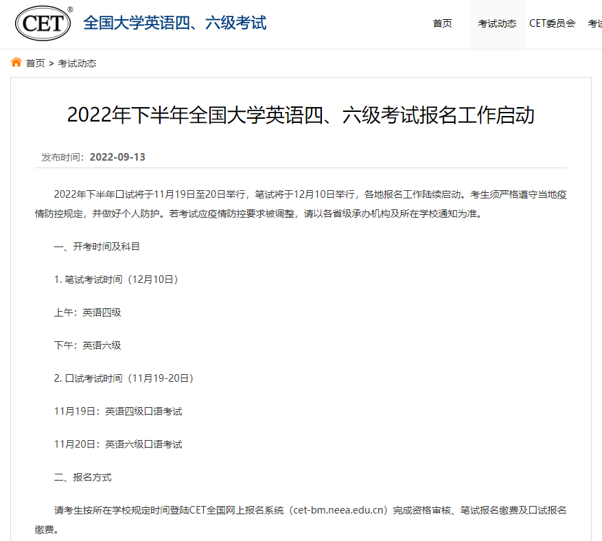 2022年下半年全国大学英语四、六级考试报名工作启动
