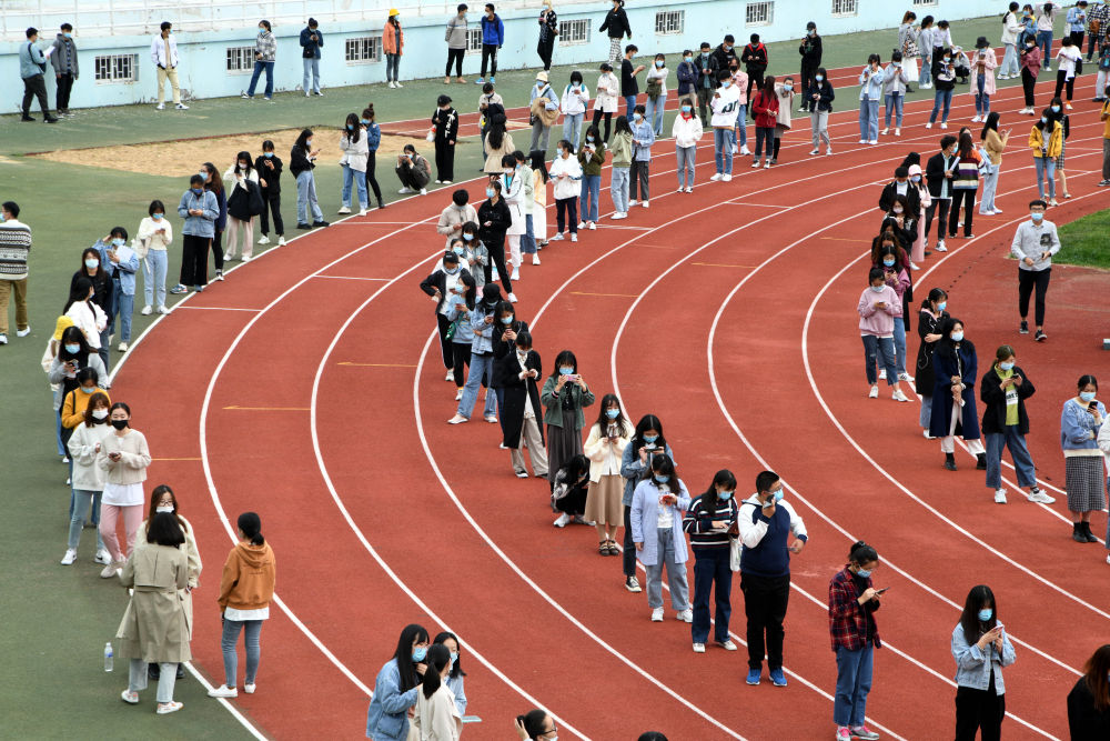 在青岛市李沧区世园街道毕家上流社区百果山游客服务中心广场,百余名居民在检测点的帐篷前排好队,10个人填一张表,每批次进10个人;在青岛大学医学院体育场,学生们绕着田径场排成半弧形队伍。