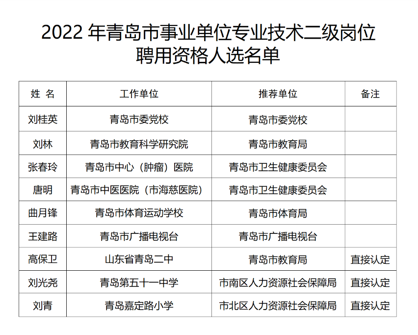 近日,青岛市人力资源和社会保障局发布《关于公布2022年事业单位专业技术二级岗位聘用资格人选的通知》,确定9名行业领军人才为事业单位专业技术二岗位聘用资格人选。