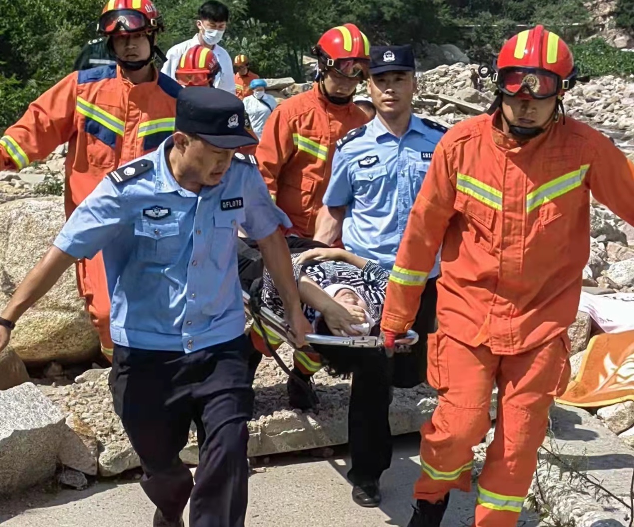 “你好!一名游客在流清河社区河道附近游玩时不慎跌落河道中,需要寻求帮助。”崂山公安分局风景区治安派出所接到这样一起求助警情。正在巡逻的民警张晓勇接到指令后火速赶到事发地,发现河床距离地面近4米高,一名老年女性精神恍惚,手捂额头蜷缩在河道的岩石上,已无法动弹,情况十分紧急。见状,民警在与救援队、120急救联系后便第一时间开辟一条安全通道,确保受伤老人及时得到救助、转移。等待过程中民警为老人进行了简单的防护并安抚其紧张情绪,最终救援人员达到现场后,民警与救援人员一同将受伤老人抬上了救护车,此刻正值正午,加上河道路况较差行走困难,到岸边已是汗流浃背。