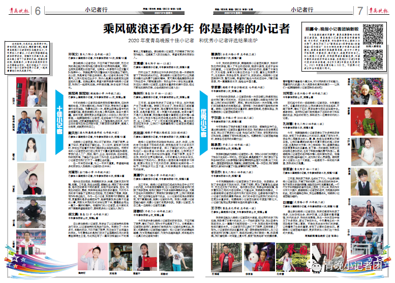 过关斩将,文武双全,恰同学少年;学有所获,快乐成长,精彩看今朝。随着青岛晚报小记者团的队伍越发壮大,今年更加人才辈出,小记者们积极踊跃地参加研学活动,投稿作文历练文采,给成长路上留下了珍贵的足迹。根据自荐材料、视频展示、日常活动表现和写作水平等综合评价,我们评选出了2020年度十佳小记者和优秀小记者,一起来看看他们的风采展示吧!