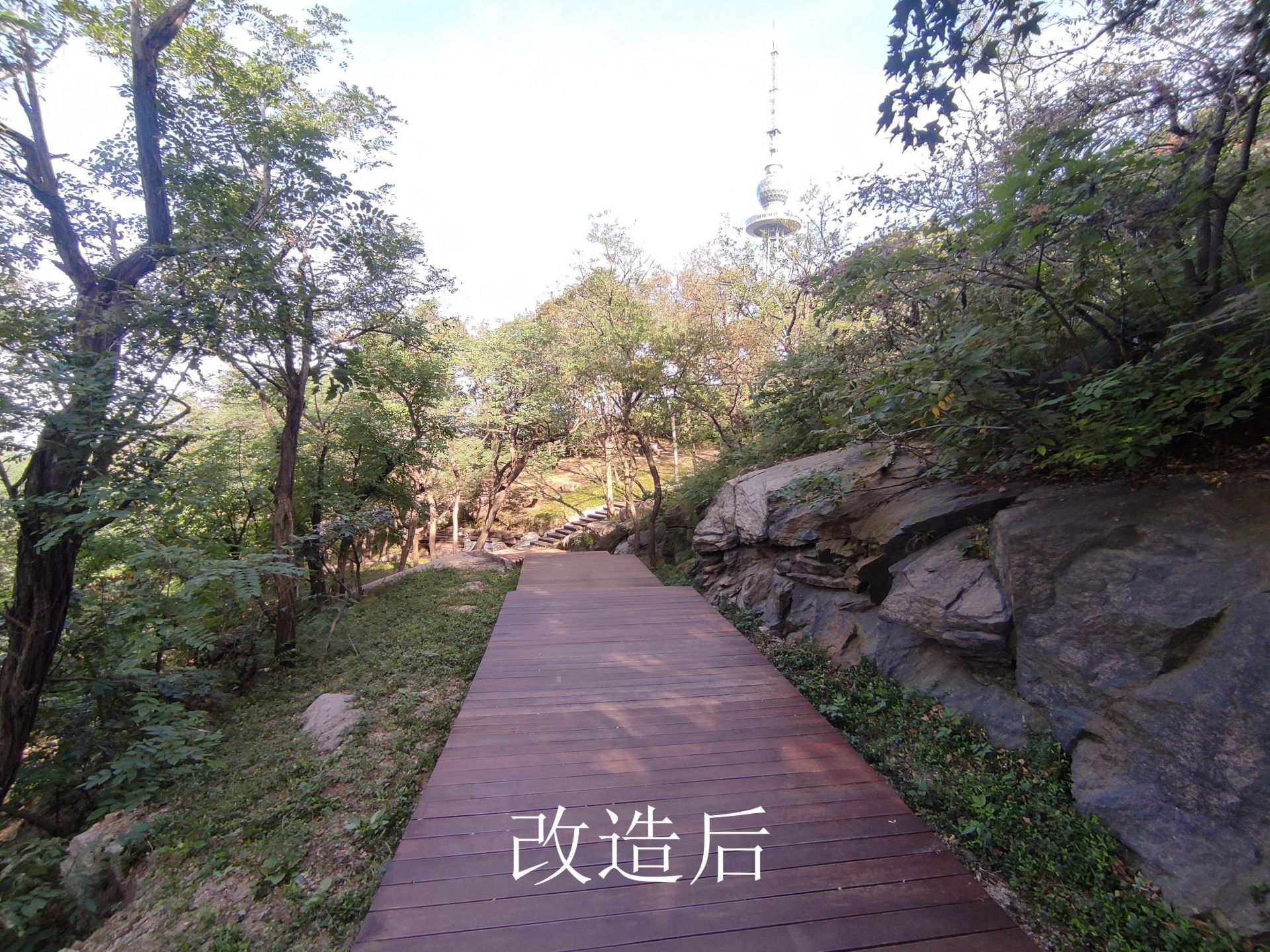 据李先生介绍,这里原来是一条老百姓自发走出来的山路,穿过树林由电视塔可到达植物园。今年年初,太平山公园启动改造,这里被封闭起来。不久前,围挡被拆除后,一条崭新的观景木栈道让人们倍感惊喜。