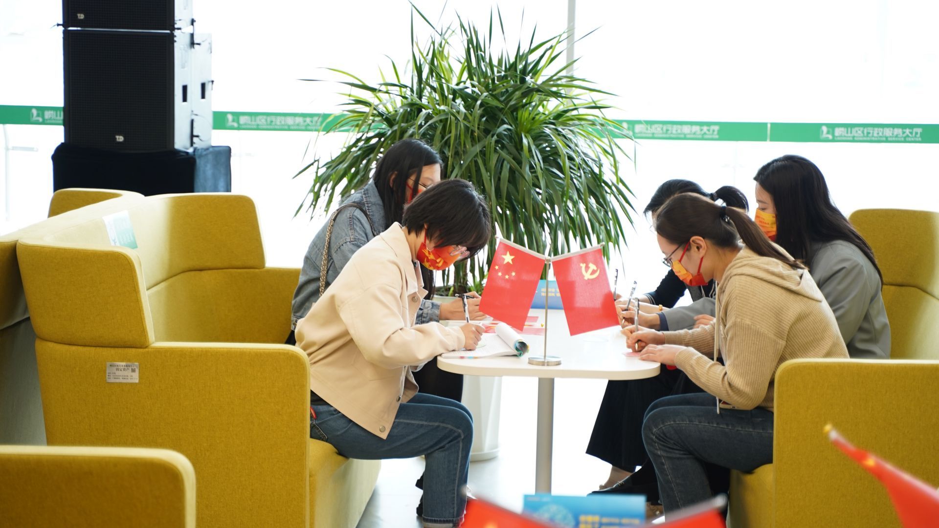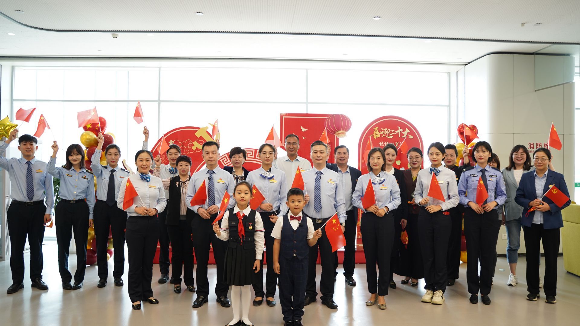 青岛日报社/观海新闻10月9日讯 “我和我的祖国,一刻也不能分割,无论我走到哪里,都流出一首赞歌......”10月8日上午11时许,清脆的童声在崂山区行政服务大厅响起,随后,身穿各式制服的窗口工作人员从四面八方齐聚三楼企业开办专区,用一首《我和我的祖国》唱响心中的爱国情怀,办事群众纷纷挥舞国旗、党旗加入合唱。一时间,大厅成了歌声与红旗的海洋。