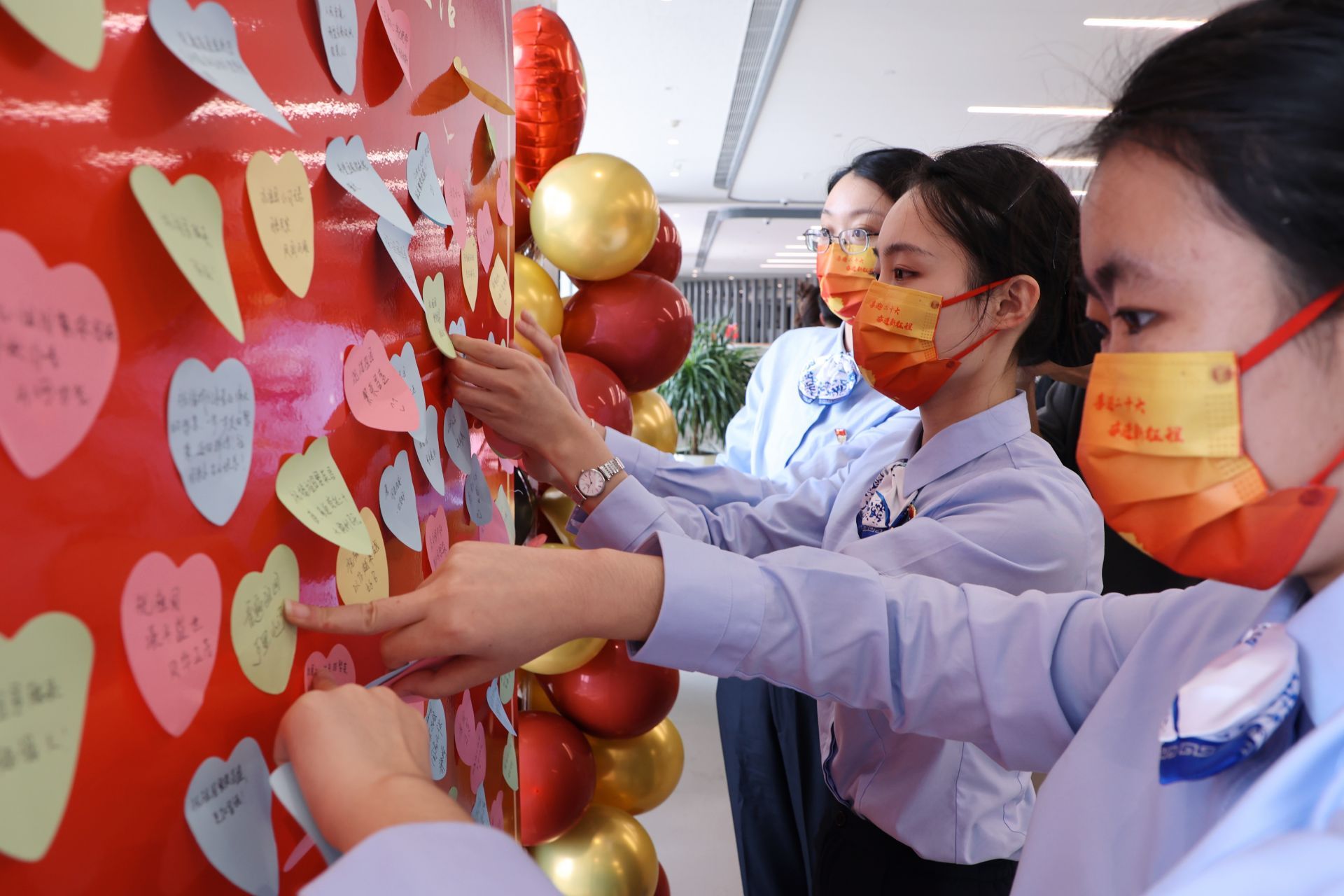 据了解,这是崂山区行政审批服务局组织的主题党日快闪活动,参与合唱的既有来自人社、医保、行政审批、市场监管、公安等各服务窗口的党员代表、团员代表,还有崂山区松岭路小学的少先队员代表和青岛微电子创新中心的企业代表。活动现场设置了心愿墙,吸引了办事群众和工作人员前来打卡。“祝愿祖国繁荣昌盛!”“为祖国的美好未来而奋斗!”大家将最真诚的祝愿落在笔下、贴在墙上,一字一句展现着对祖国美好明天的祝愿与期盼。