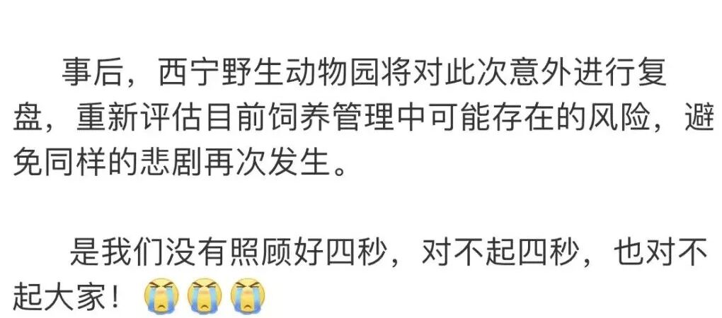 西宁野生动物园表示,“将对此次意外进行复盘,重新评估目前饲养管理中可能存在的风险,避免同样的悲剧再次发生。”