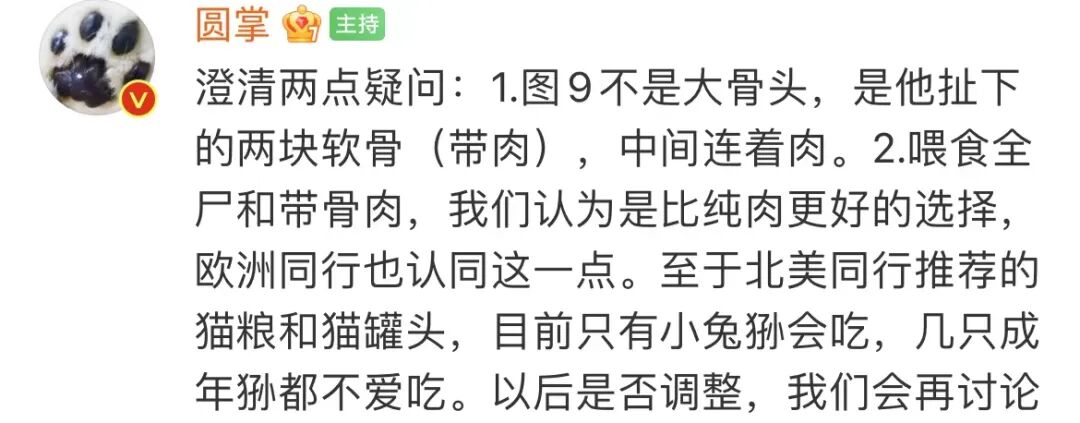 西宁野生动物园副园长、“科普博主@圆章”齐新章回应:①图9不是大骨头,是他扯下的两块软骨(带肉),中间连着肉。②喂食全尸和带骨肉,我们认为是比纯肉更好的选择,欧洲同行也认同这一点。