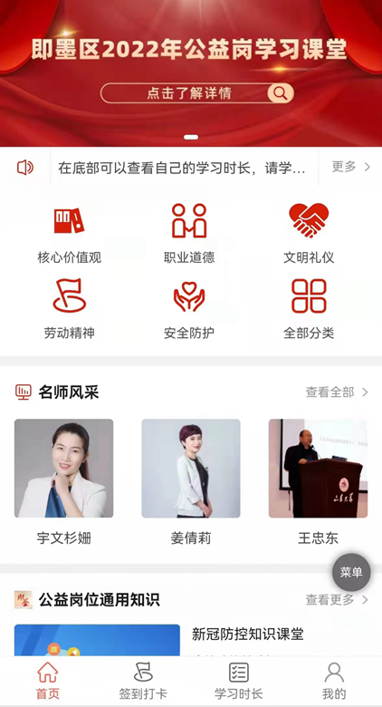 考虑到疫情防控需要,结合公益岗安置人员提升岗位适应能力和专业技能的需求,即墨区特组织开发了“公益岗线上学习课堂”,课堂内容涵盖了社会主义核心价值观、安全防护、劳动精神、职业道德、疫情防控等6大板块,设立线上课程12节,将通用知识全部纳入其中。学员通过一部手机就可实现线上报名、线上学习、培训追溯,缓解了基层疫情防控压力和上岗人员的工学矛盾。