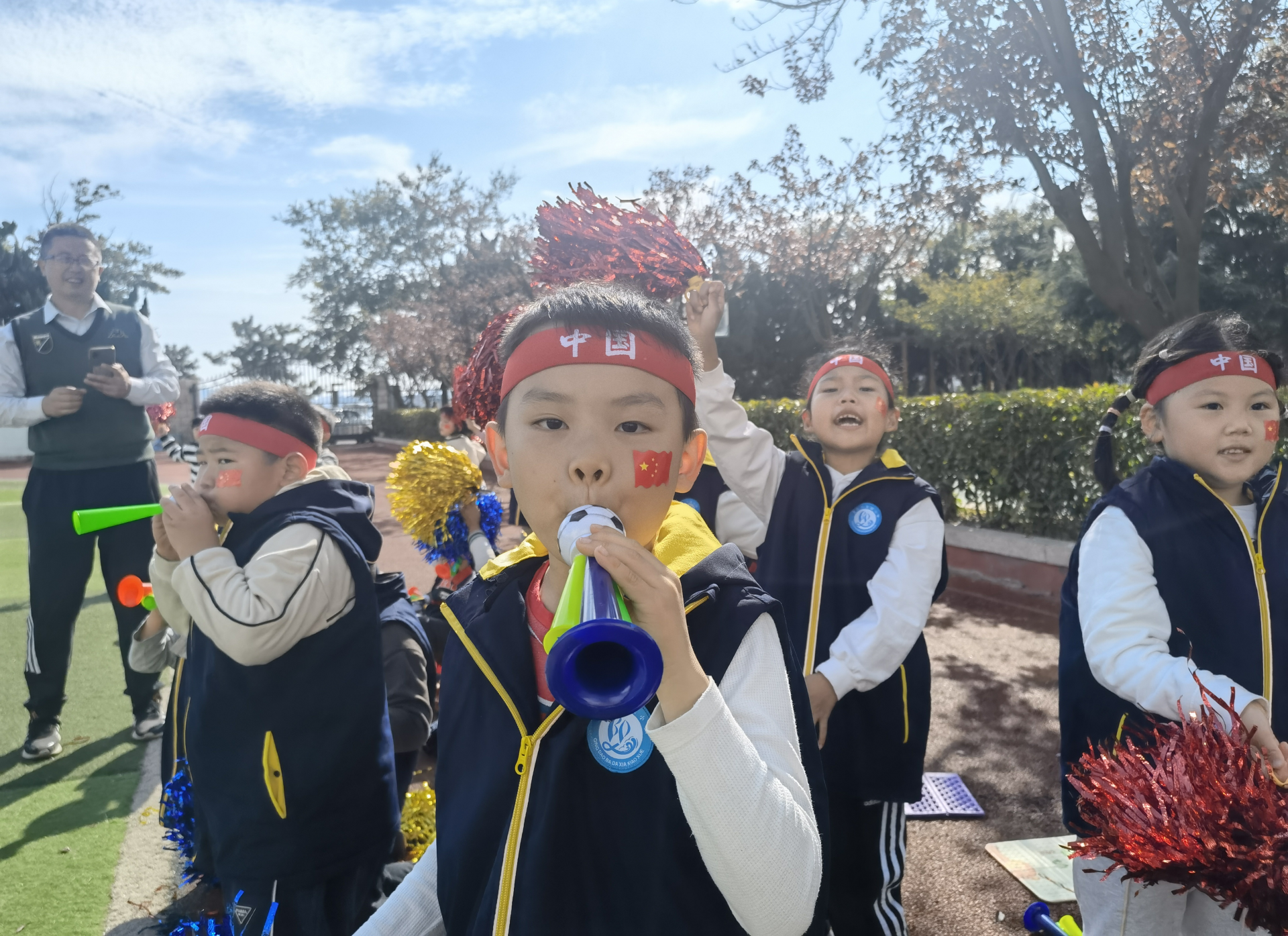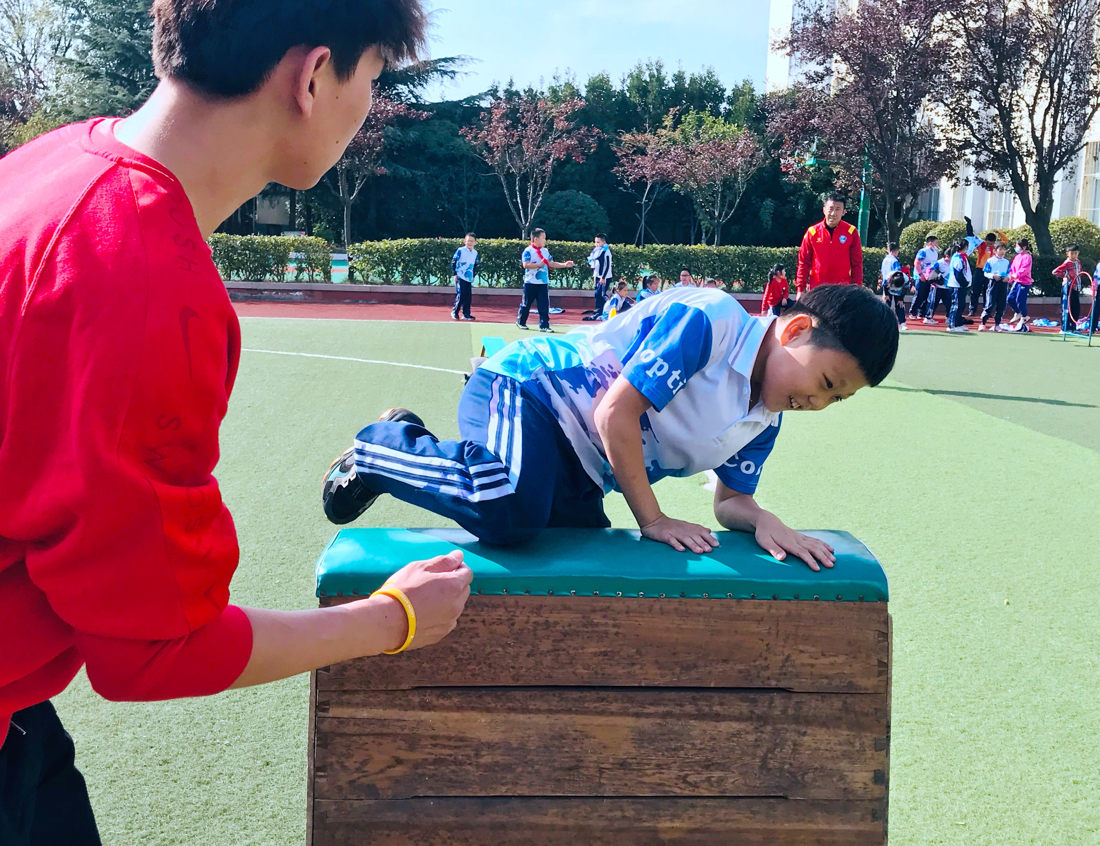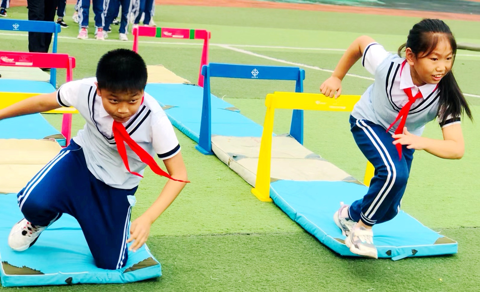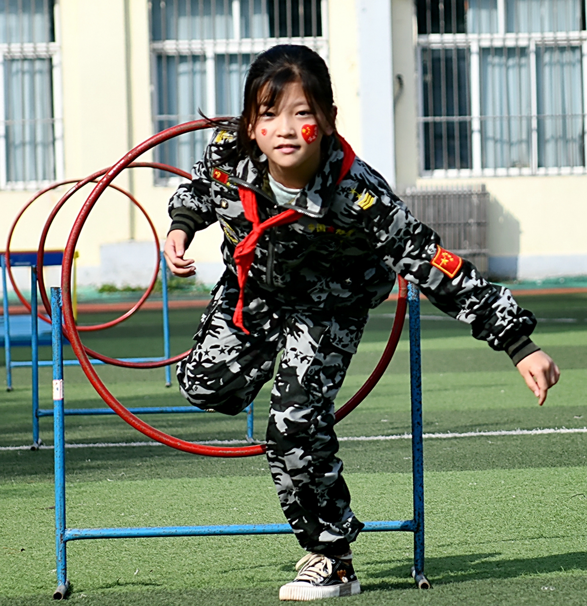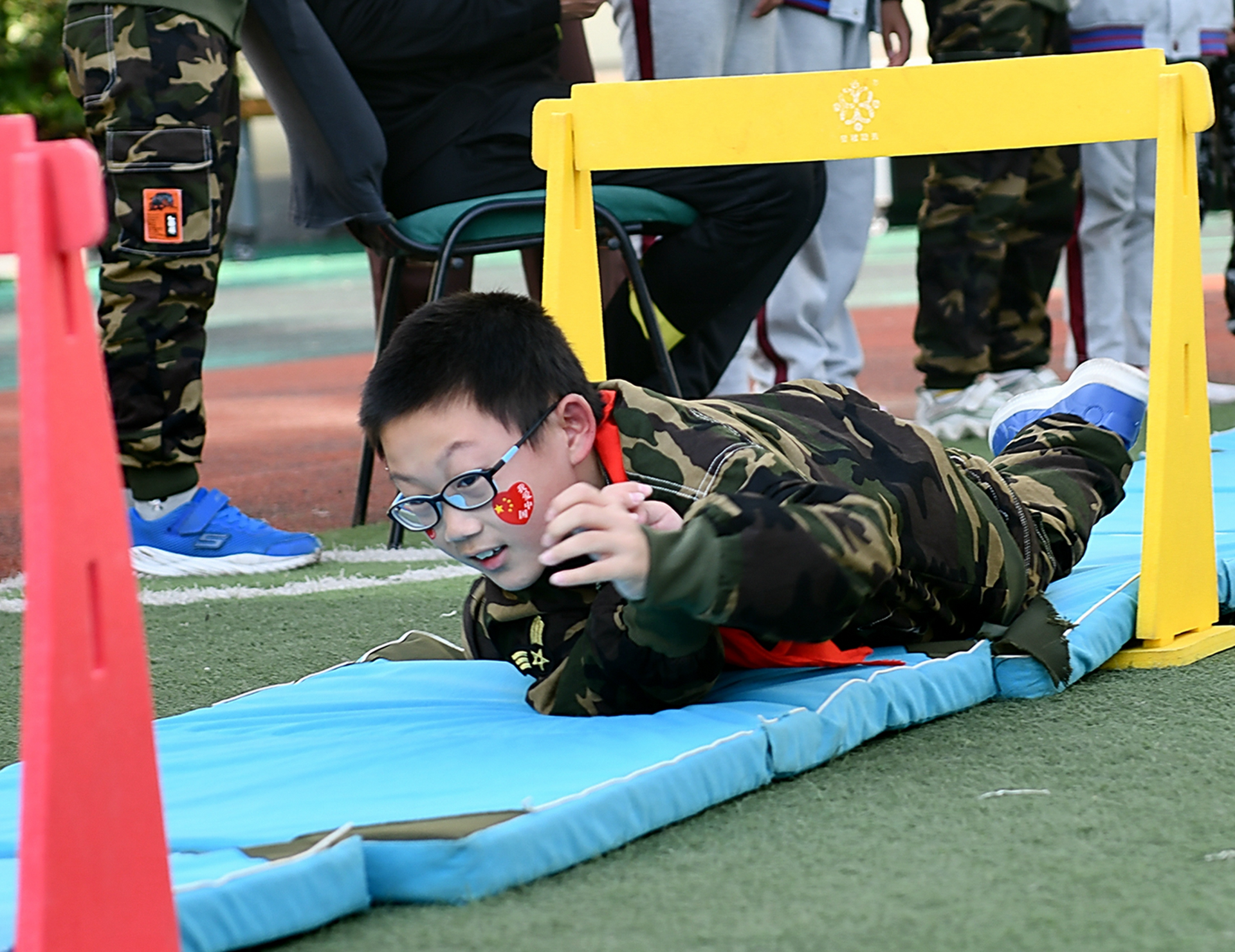 本次运动会,学校将体育与爱国教育、国防教育相融合,还原革命先烈在长征路上的场景,特别策划了爬过“草地”、穿过“密林”、险过“独木桥”、勇攀“雪山”、跨过“雷区”、穿过“封锁线”、投掷“手雷”等与长征有关的特色活动。