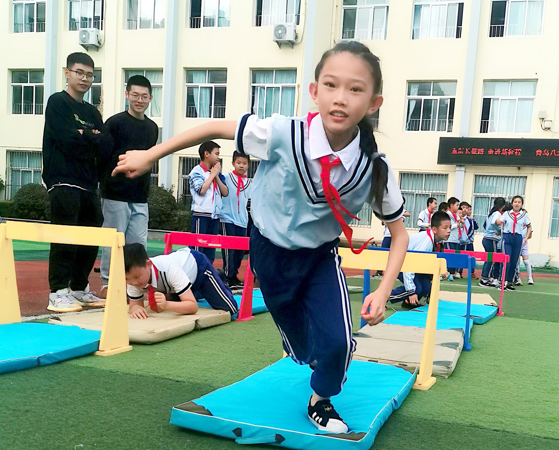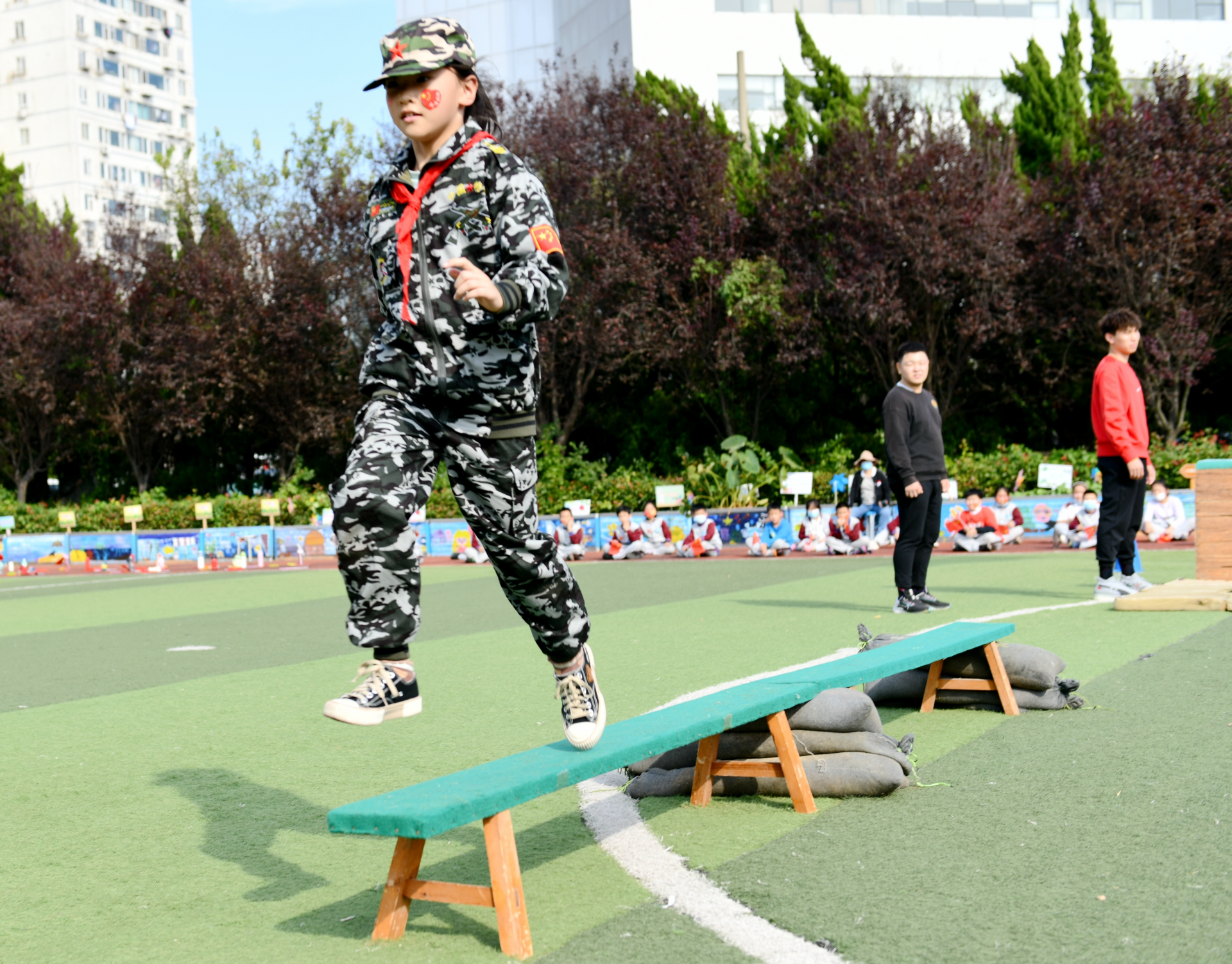 活动中,学生们在穿过“长征险关”中感受革命前辈的不屈精神和英勇气概;在攀爬、钻圈、平衡木、跨栏、跳箱、投掷中锤炼意志,提高身体素质,展现新时代少年不惧挑战,敢闯、敢拼的向上风貌。(青岛日报/观海新闻记者 王沐源)