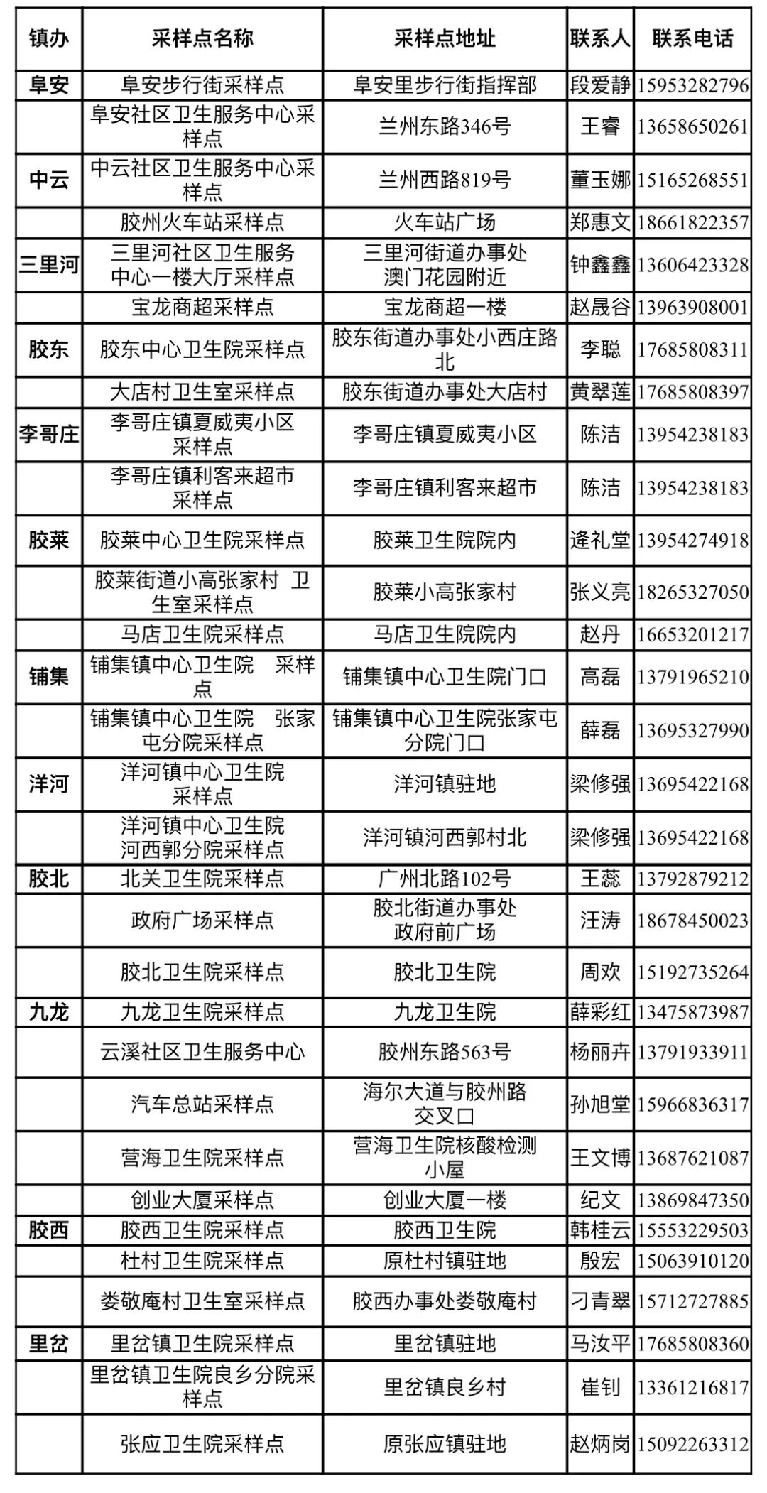 10月17日-18日,我市将继续保留31个核酸采样点(见下图),继续做好流动人口、来胶人员和其他未检人员的核酸检测工作,请尚未检测人员携带有效身份证件,在8:00至20:00之间,就近进行采样,相关费用由市财政负担。如您有不方便出门的家属,请及时联系各采样点联系人,我们将安排工作人员上门采样。