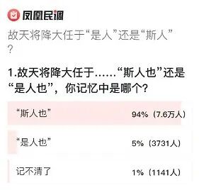 曾有媒体就“故天将降大任于‘是人也’还是‘斯人也’”发布调查,结果显示,有94%参与投票的网友表示,记忆中是“斯人也”。