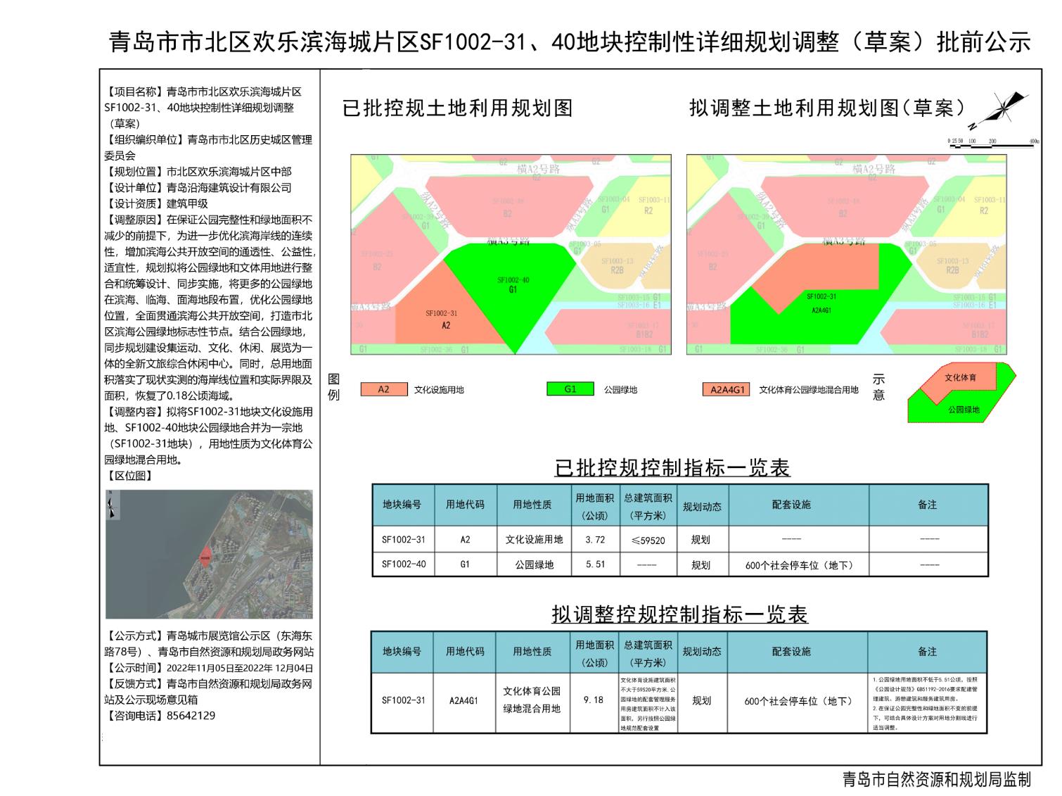 青岛日报社/观海新闻11月5日 今日,青岛市自然资源和规划局发布了《青岛市市北区欢乐滨海城片区SF1002-31、40地块控制性详细规划调整(草案)批前公示》,项目位于市北区欢乐滨海城片区中部。