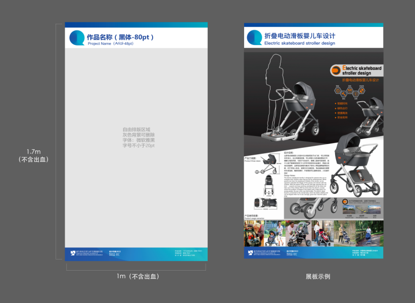 2.图板:请根据模板(因展示时打印质量有清晰度要求,建议不要压缩,模板源文件请咨询文末的付老师,统一提供,电话附后),设计展板1张,规格要求为宽900mm,高1500mm,分辨率100像素,内容应为实物图片。右下角按要求标明参赛作品名称、申报类别、设计者,字体统一用黑体20pt,内容文字使用微软雅黑,20pt。