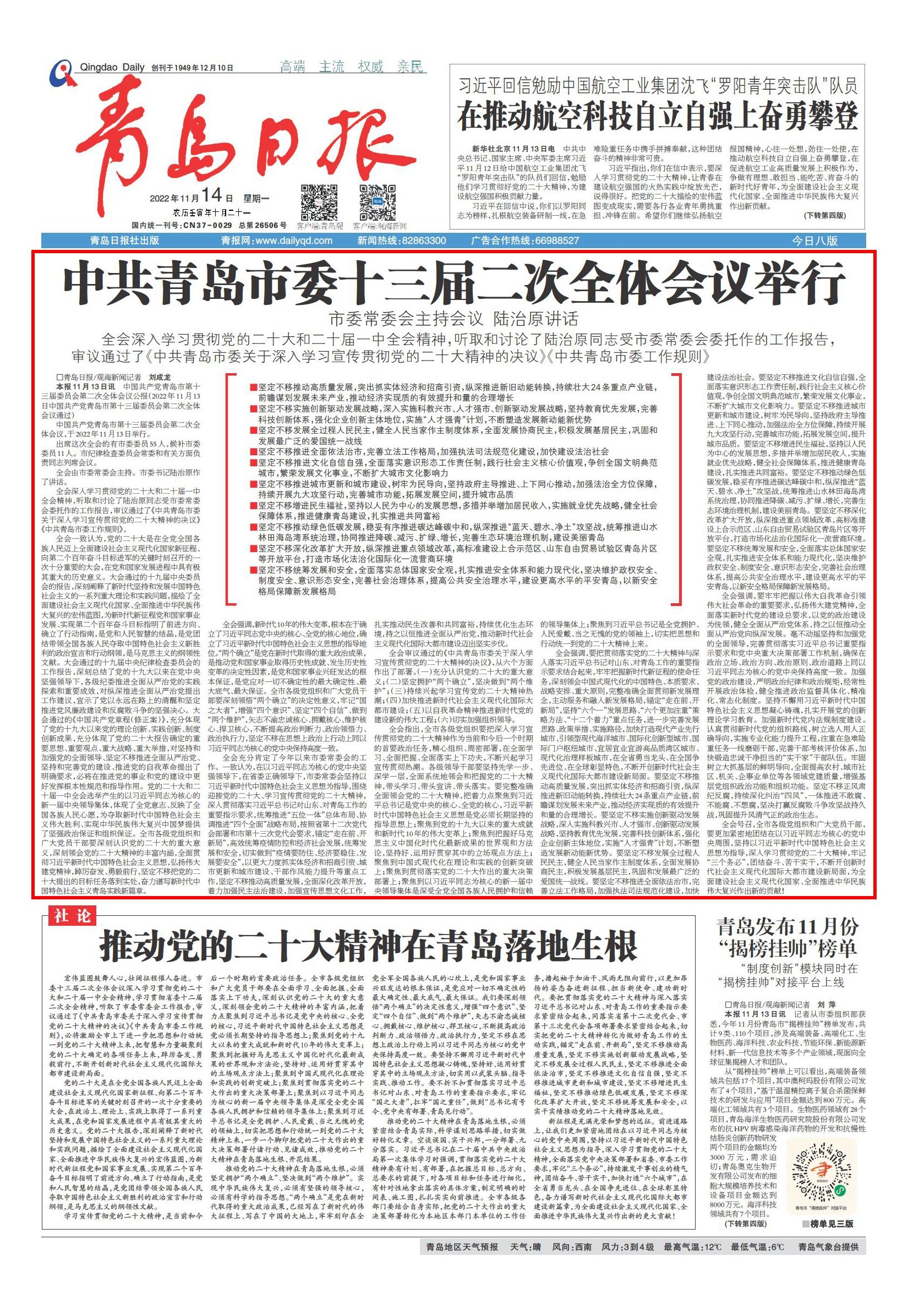 中国共产党青岛市第十三届委员会第二次全体会议,于2022年11月13日举行。