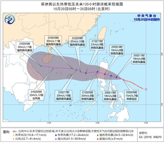 预计,该低压将以每小时20-25公里的速度向西偏北方向移动,将于今天加强为今年第17号台风,并将于21日移入南海,以后逐渐趋向南海西部海面,强度继续加强,预计最大强度为强热带风暴级或台风级(10-12级,28-33米/秒)。