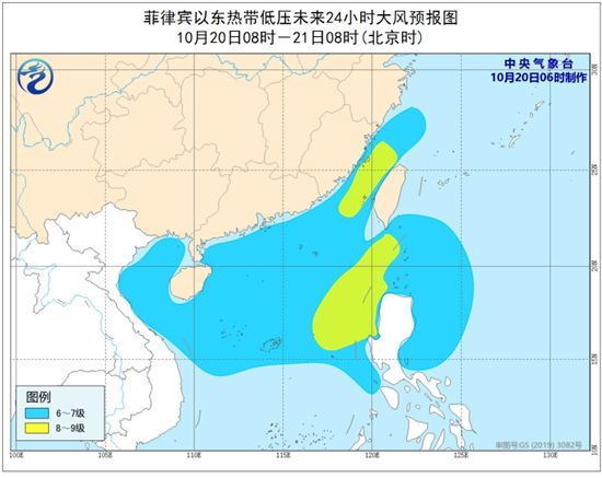 大风预报:受热带低压和冷空气的共同影响,20日08时到21日08时,东海西南部海域、台湾海峡、台湾以东洋面偏南海域、巴士海峡、南海北部和中部海域、北部湾以及西沙群岛附近海域有6-7级大风,其中台湾海峡、巴士海峡偏西海域、南海东北部和中东部的部分海域风力可达8-9级、阵风10级。
