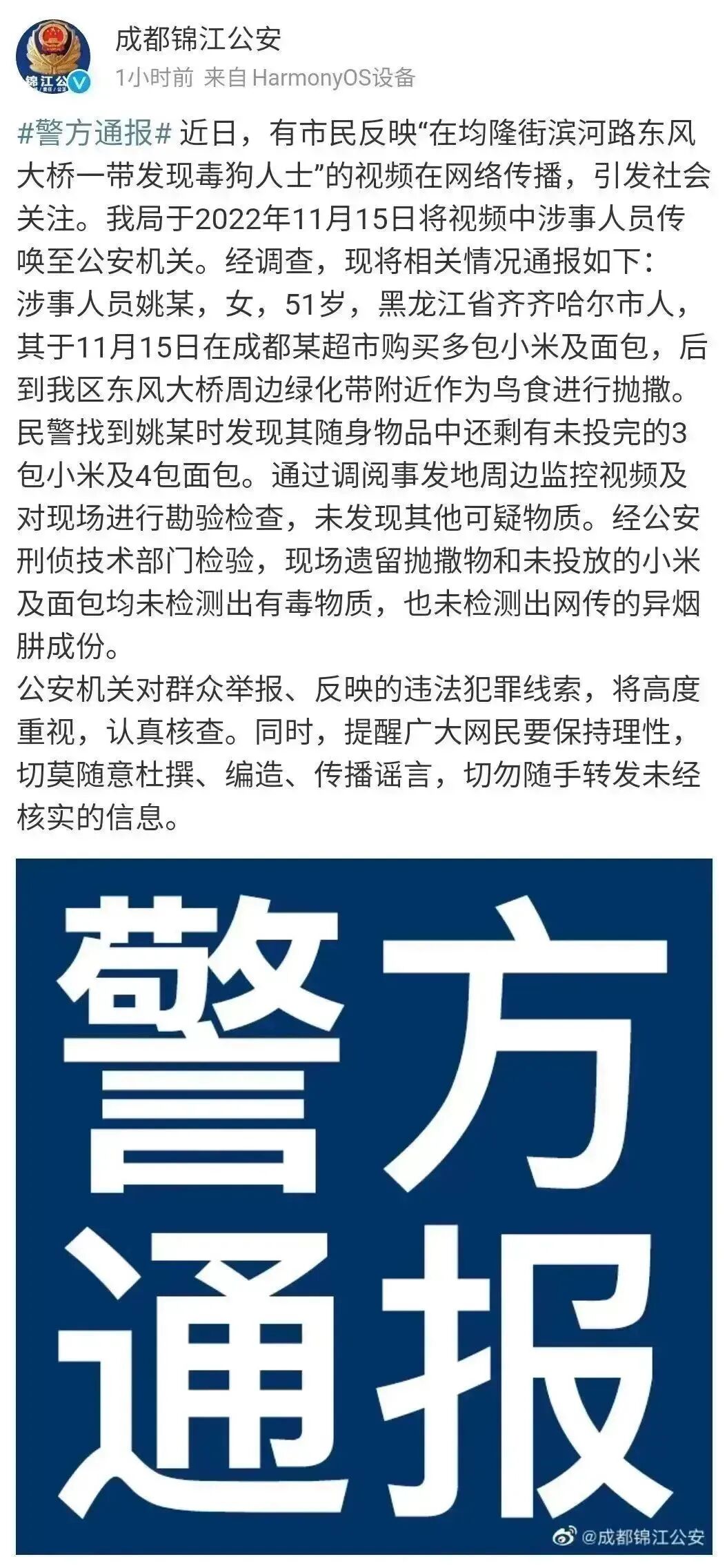 涉事人员姚某,女,51岁,黑龙江省齐齐哈尔市人,其于11月15日在成都某超市购买多包小米及面包,后到我区东风大桥周边绿化带附近作为鸟食进行抛撒。民警找到姚某时发现其随身物品中还剩有未投完的3包小米及4包面包。通过调阅事发地周边监控视频及对现场进行勘验检查,未发现其他可疑物质。经公安刑侦技术部门检验,现场遗留抛撒物和未投放的小米及面包均未检测出有毒物质,也未检测出网传的异烟肼成分。