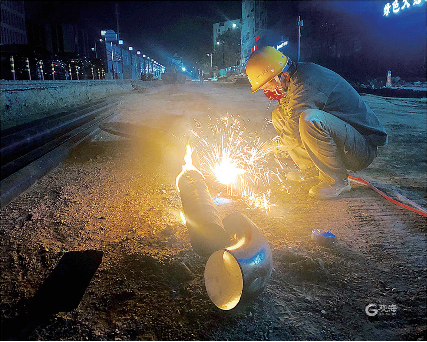 说话间,南京路、重庆路路口的管道坑底传来了焊工白师傅的吆喝声:“活快干完哩,大家都加油!”记者看到,3米深的管道坑内火花四溅,四五名施工人员正在焊接安装一条供水支管线——他们已连续作业近40分钟。