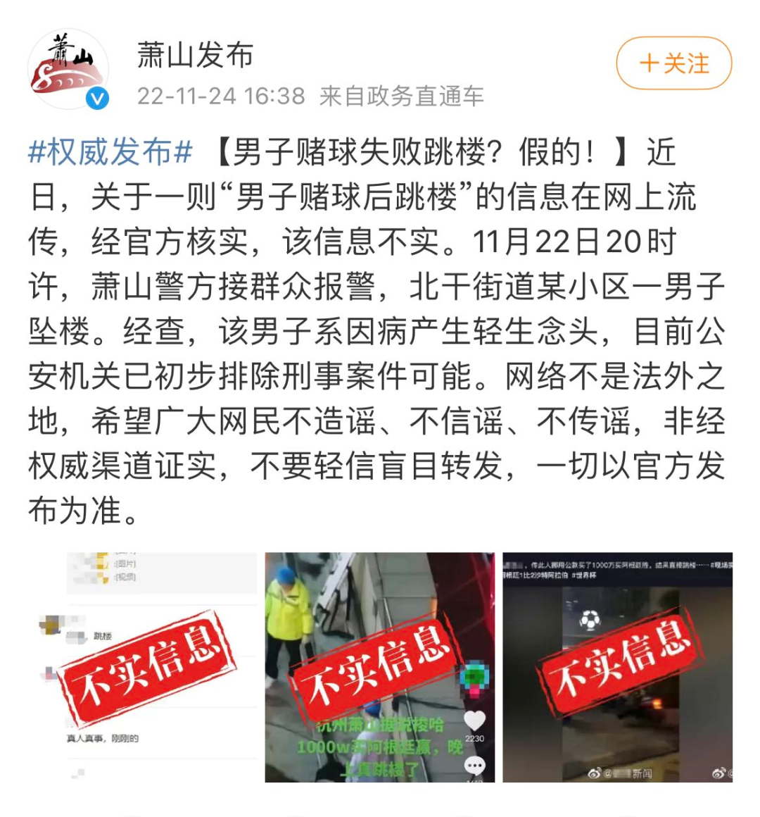 据浙江省杭州市萧山区人民政府新闻办公室官方微博消息,近日,关于一则“男子赌球后跳楼”的信息在网上流传,经官方核实,该信息不实。11月22日20时许,萧山警方接群众报警,北干街道某小区一男子坠楼。经查,该男子系因病产生轻生念头,目前公安机关已初步排除刑事案件可能。网络不是法外之地,希望广大网民不造谣、不信谣、不传谣,非经权威渠道证实,不要轻信盲目转发,一切以官方发布为准。