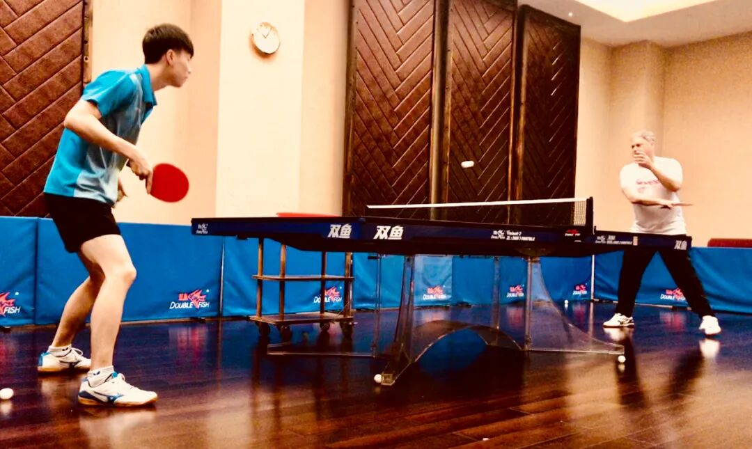 ▲ 资料图片:乔希·塞利格(右)与中国乒乓球教练打球。图由受访者提供