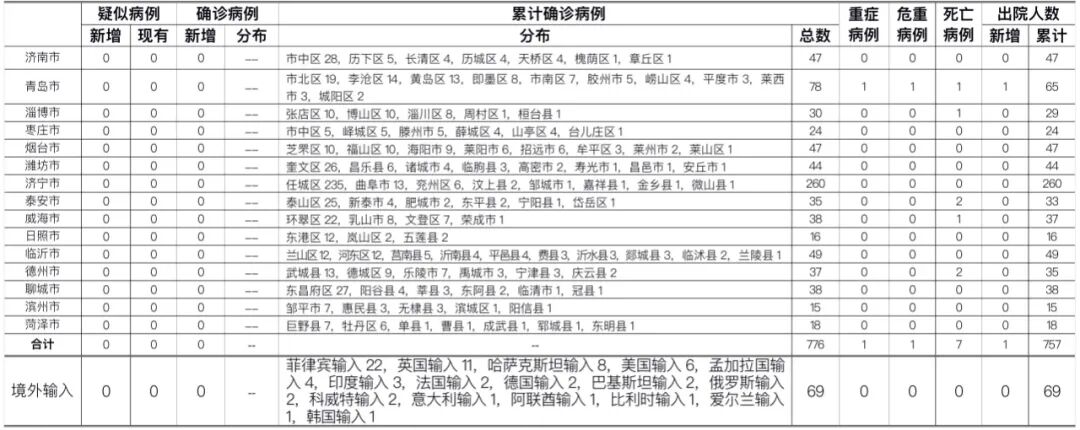 山东无新增本地疑似病例、确诊病例。累计报告确诊病例776例,死亡7例。新增治愈出院病例1例,累计治愈出院757例。