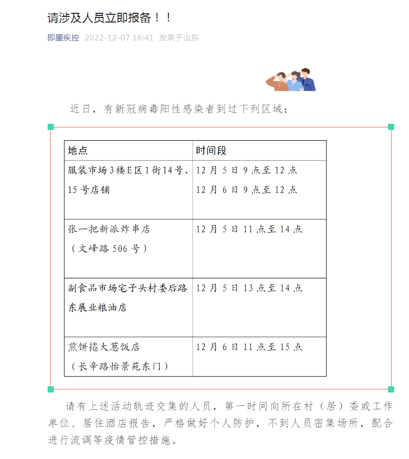 即墨疾控:请涉及人员立即报备 2022-12-07 16:47 即墨疾控 0 近日,有新冠病毒阳性感染者到过下列区域: 请有上述活动轨迹交集的人员,第一时间向所在村(居)委或工作单位、居住酒店报告,严格做好个人防护,不到人员密集场所,配合进行流调等疫情管控措施。 责任编辑:王凤一