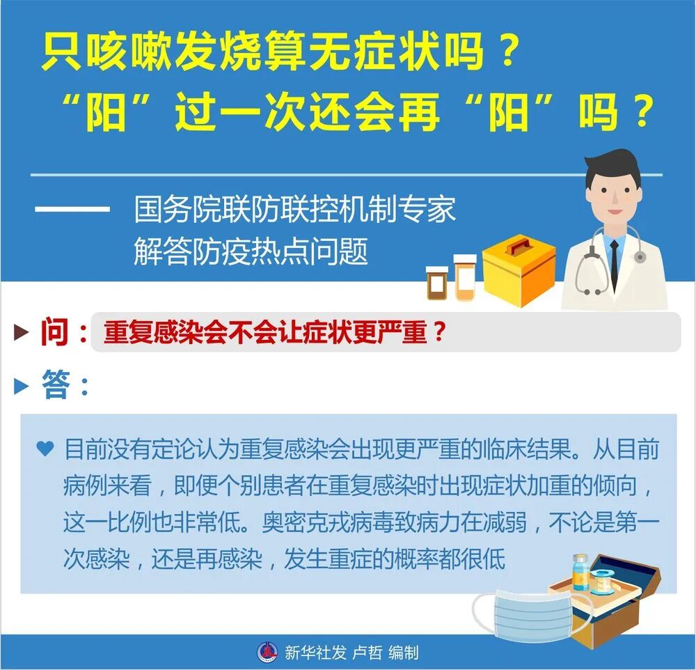 奥密克戎致病力在减弱,感染后大多表现为无症状或轻型。只咳嗽、发烧算无症状吗?“阳”过一次还会再“阳”吗?围绕公众关注的热点问题,国务院联防联控机制有关专家作出专业解答。