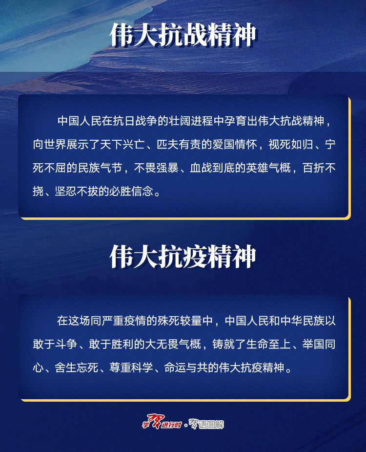 9月3日,习近平在纪念中国人民抗日战争暨世界反法西斯战争胜利75周年座谈会上强调,伟大抗战精神,是中国人民弥足珍贵的精神财富,将永远激励中国人民克服一切艰难险阻、为实现中华民族伟大复兴而奋斗。