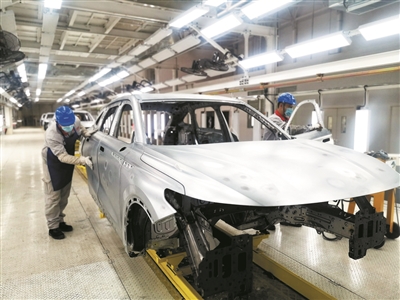 奇瑞青岛工厂内,工作人员正在组装车体。 王涛 摄