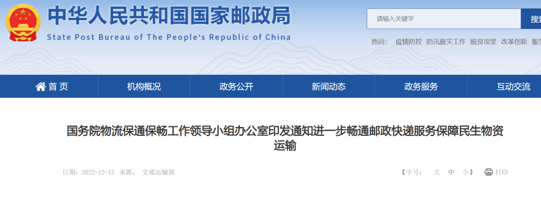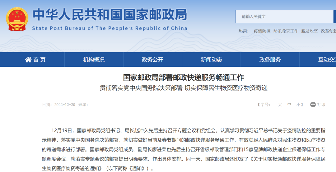 12月20日,国家邮政局再次发文,部署邮政快递畅通工作: