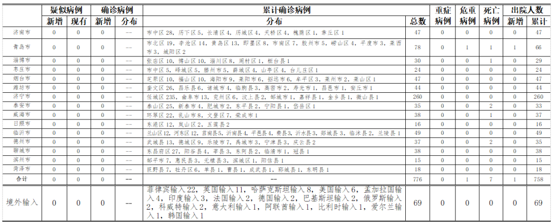 山东无新增本地疑似病例、确诊病例。累计报告确诊病例776例,死亡7例。新增治愈出院病例1例,累计治愈出院758例。