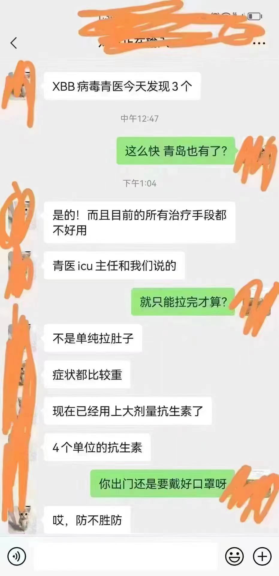 近日,在青岛各个群中流传着一张截图,截图称青医(现在的青大附院)发现3例XBB病毒患者,并且截图中说目前所有的治疗手段均不好用,症状都比较重,现在已经用上大量的抗生素。