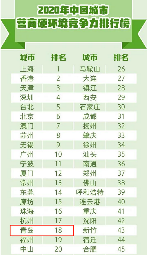 在本次排行榜上,青岛还有一个看点,那就是在营商环境上的表现不错:在“营商硬环境竞争力排行榜”中,排名第18位;在“营商软环境竞争力排行榜”中,排名第14位。