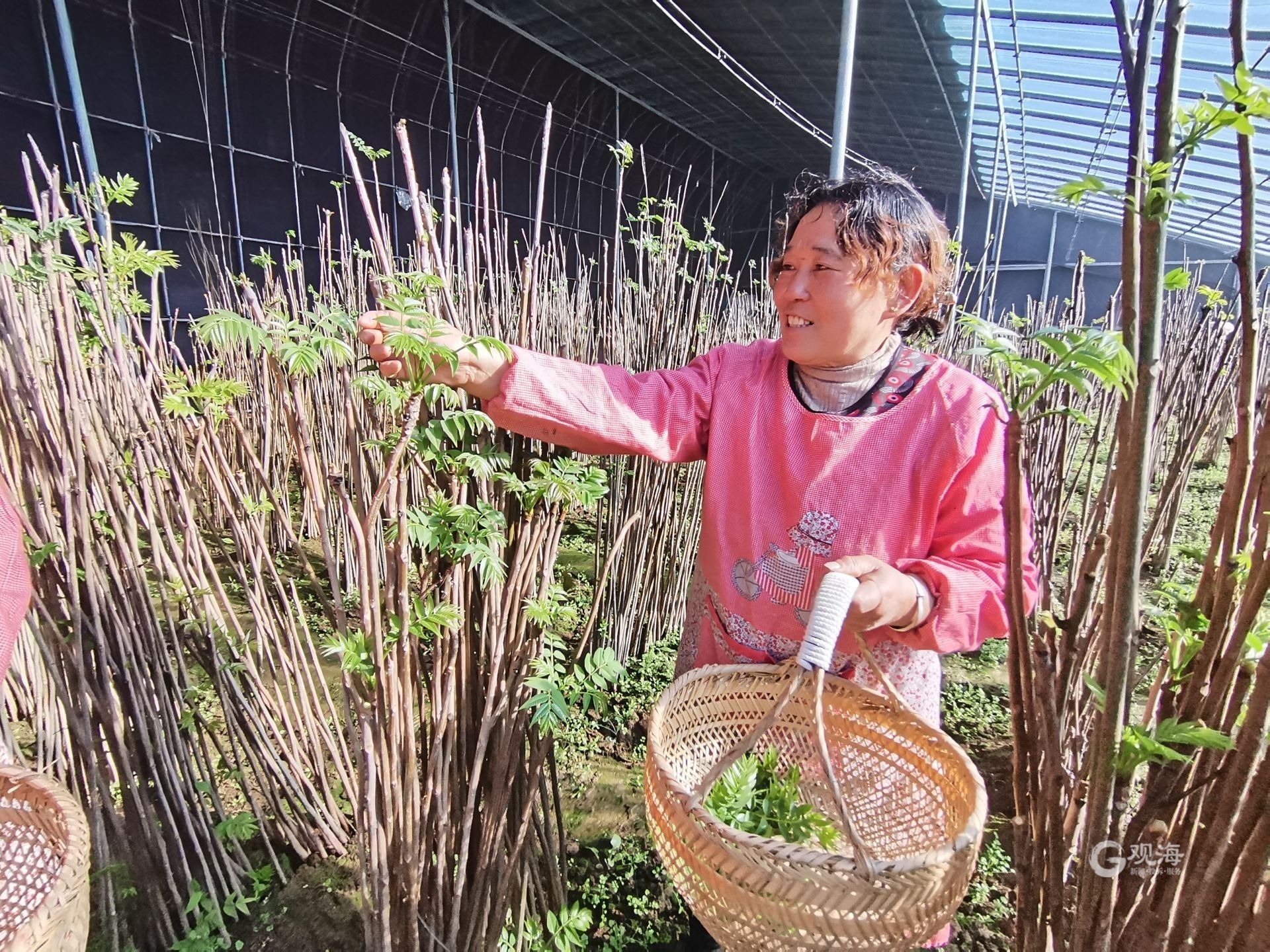 村民正在大棚内采摘香椿。