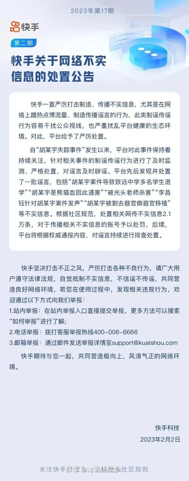 2月2日,@微博管理员、快手官方分别发布涉胡某宇事件虚假谣言公告,全文如下: