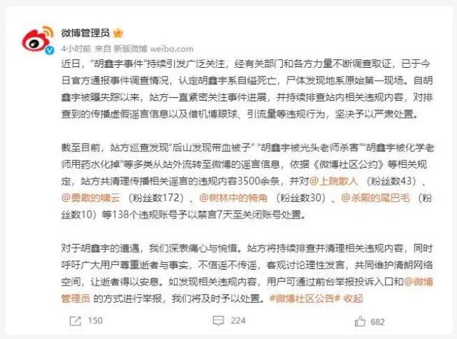 截至目前,站方巡查发现“后山发现带血被子” “胡鑫宇被光头老师杀害”“胡鑫宇被化学老师用药水化掉”等多类从站外流转至微博的谣言信息,依据《微博社区公约》等相关规定,站方共清理传播相关谣言的违规内容3500余条,并对@上院散人 (粉丝数43)、@勇敢的啸云 (粉丝数172)、@树林中的犄角 (粉丝数30)、@杀殿的尾巴毛 (粉丝数10)等138个违规账号予以禁言7天至关闭账号处置。