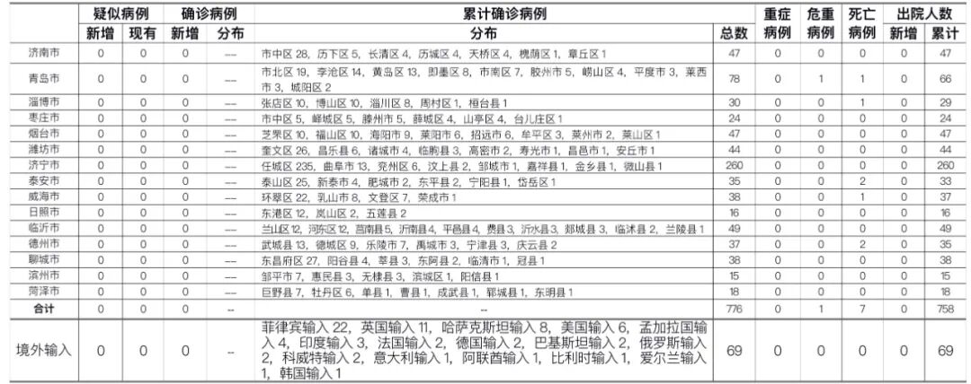 山东无新增本地疑似病例、确诊病例。累计报告确诊病例776例,死亡7例,治愈出院758例。