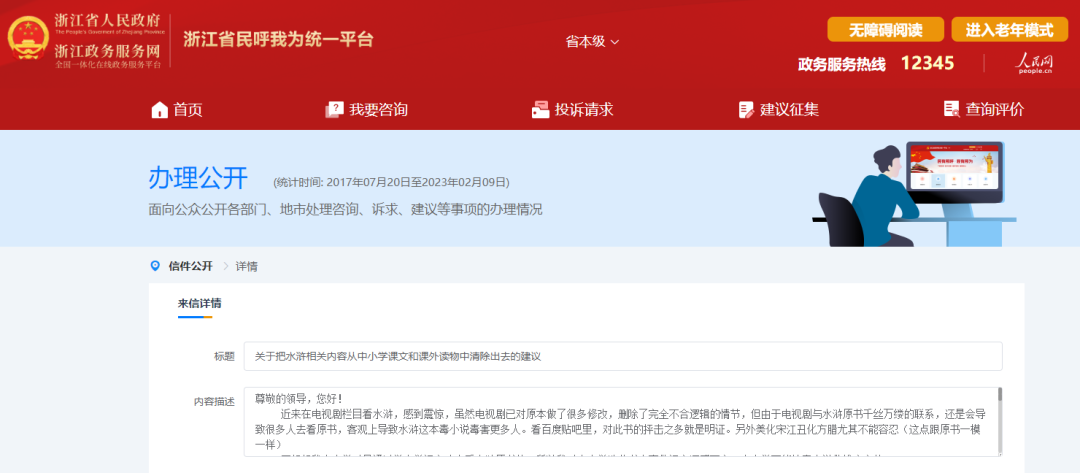 近日,有网民在浙江省人民政府网站建议“把《水浒》相关内容从中小学课文和课外读物中清除出去”。对此,浙江省教育厅教研室日前作出专门答复。