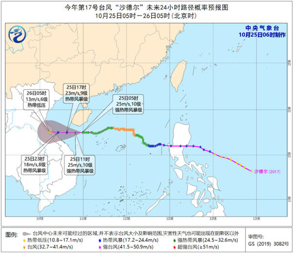 中央气象台10月25日06时继续发布台风黄色预警:今年第17号台风“沙德尔”(强热带风暴级)的中心今天(25日)早晨5点钟位于海南省三亚市南偏东方约95公里的海面上,就是北纬17.5度、东经109.9度,中心附近最大风力有10级(25米/秒),中心最低气压为990百帕,七级风圈半径200-300公里。