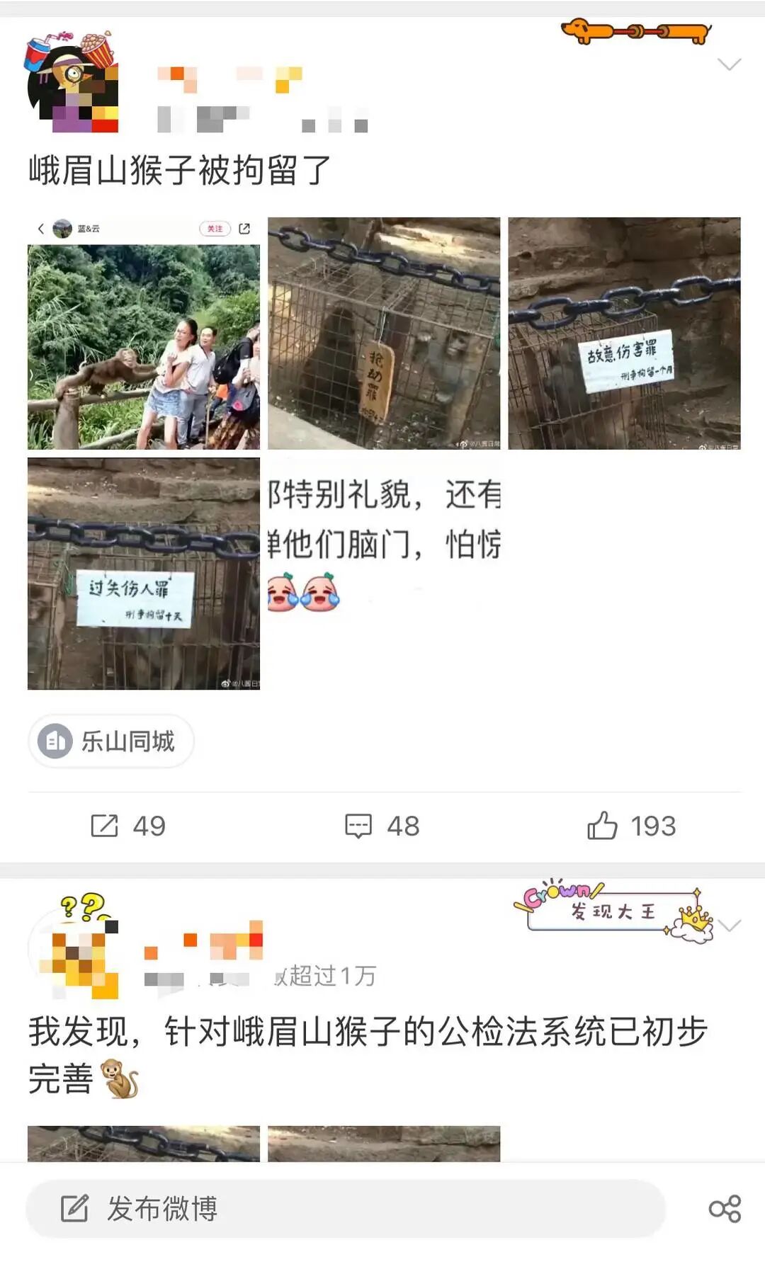 此外还有一张配有“峨眉山猴子被判刑了,这下可以放心去了”的文字。