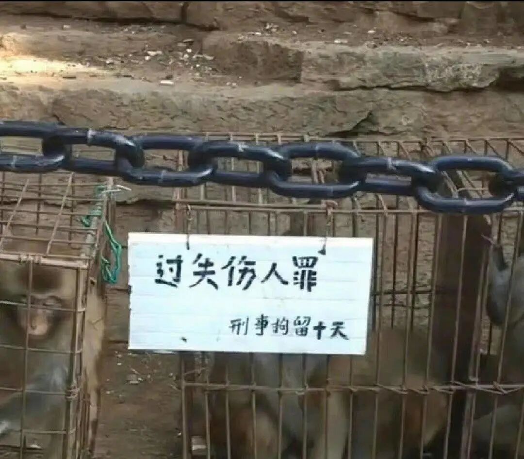图片中,有猴子被关在铁笼内,笼上挂有“抢劫罪,拘留十天”“故意伤害罪,刑事拘留一个月”“过失伤人罪,刑事拘留十天”等木牌。