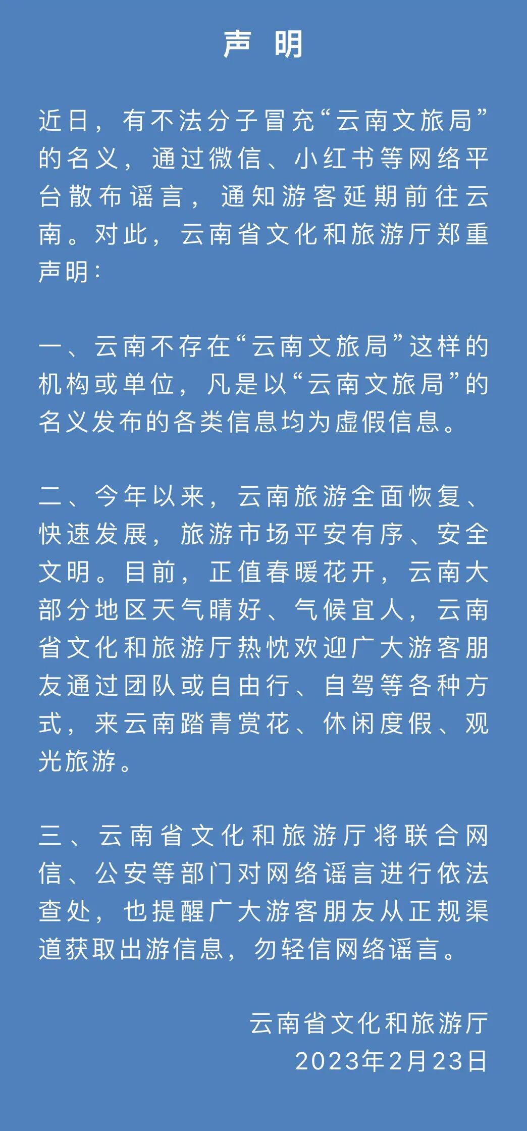 近日,有不法分子冒充“云南文旅局”的名义,通过微信、小红书等网络平台散布谣言,通知游客延期前往云南。对此,云南省文化和旅游厅表示,不存在“云南文旅局”这样的机构或单位,凡是以此名义发布的各类信息均为虚假信息。当前,春光正好,欢迎广大游客来云南观光旅游。以下为云南省文化和旅游厅2月23日发布的声明: