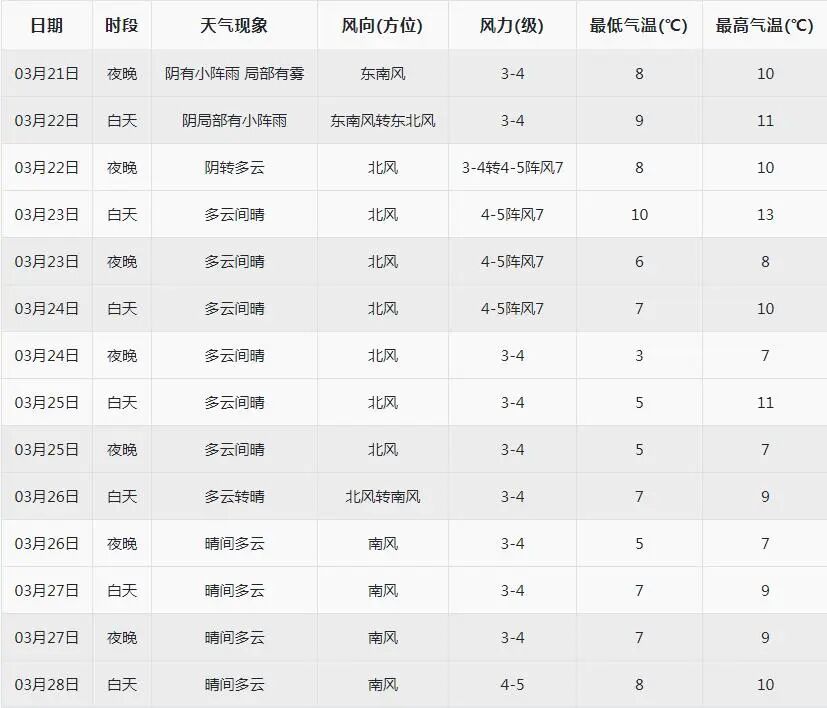 【青岛市区】今天夜间,阴有小阵雨,局部有雾,东南风3到4级,明天白天,阴局部有小阵雨,东南风转东北风3到4级,相对湿度70%-95%,明天最低气温8℃,最高气温11℃。23日:阴转多云,北风3到4级转4到5级阵风7级,8到13℃。24日:多云间晴,北风4到5级阵风7级,6到10℃。