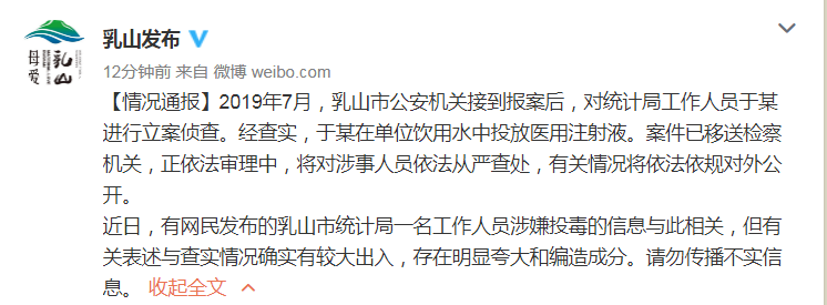 【情况通报】2019年7月,乳山市公安机关接到报案后,对统计局工作人员于某进行立案侦查。经查实,于某在单位饮用水中投放医用注射液。案件已移送检察机关,正依法审理中,将对涉事人员依法从严查处,有关情况将依法依规对外公开。