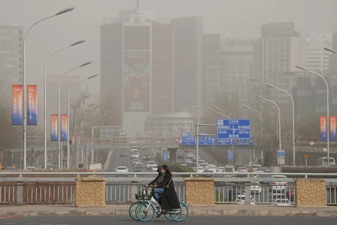 3月22日,在北京市东三环,市民在沙尘天气中骑行。新华社记者 鞠焕宗 摄