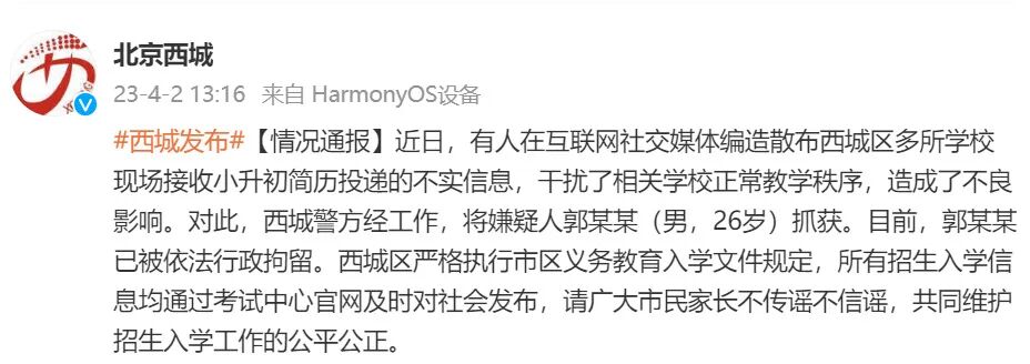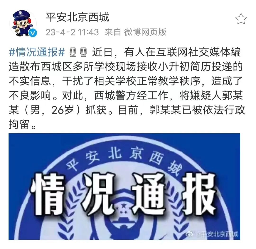 4月2日,北京市公安局西城分局官方微博@平安北京西城 通报,近日,有人在互联网社交媒体编造散布西城区多所学校现场接收小升初简历投递的不实信息,干扰了相关学校正常教学秩序,造成了不良影响。对此,西城警方经工作,将嫌疑人郭某某(男,26岁)抓获。目前,郭某某已被依法行政拘留。