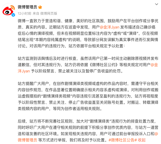 31日,@微博管理员 发布消息称,对其违规行为,站方仍将依据《微博社区公约》等相关规定对用户@金洋Jyan 予以阶段禁言、禁止被关注以及暂停广告收益的处罚。