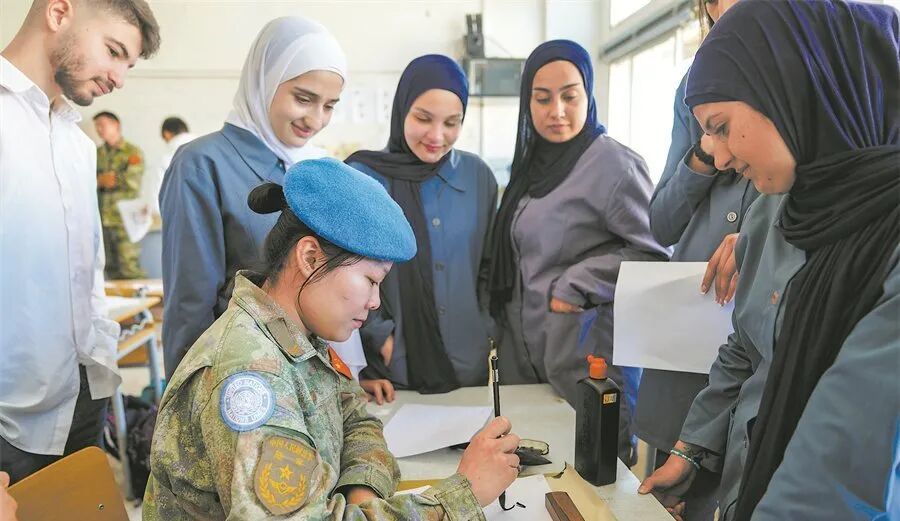 近日,在联合国中文日即将来临之际,中国第21批赴黎巴嫩维和多功能工兵分队官兵前往当地拉赫曼·尤努斯中学举行中文课堂活动。