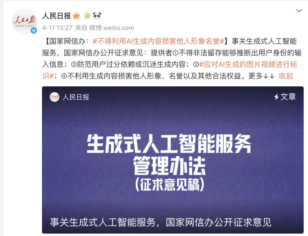 4月11日,针对生成式人工智能服务,国家网信办公开征求意见:提供者①不得非法留存能够推断出用户身份的输入信息;②防范用户过分依赖或沉迷生成内容;③应对AI生成的图片视频进行标识;④不利用生成内容损害他人形象、名誉以及其他合法权益。